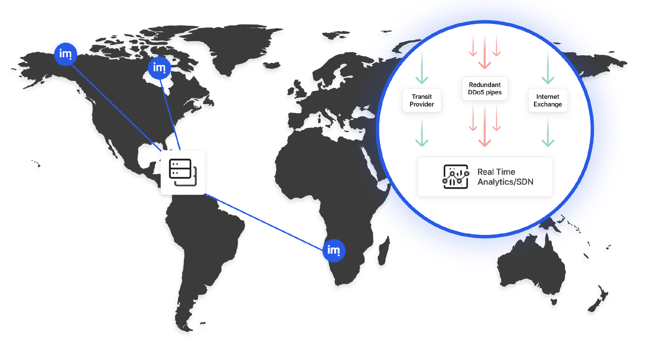 隨著攻擊規模持續擴大,DDoS 防護已成為企業網路安全的重要環節。Imperva 結合 DNS 轉向與 Anycast 路由,將攻擊流量分散至多個雲端處理中心。在每個雲端處理中心,Imperva 自有的 Behemoth 設備可在數秒內即時識別並過濾惡意流量,確保服務穩定性。