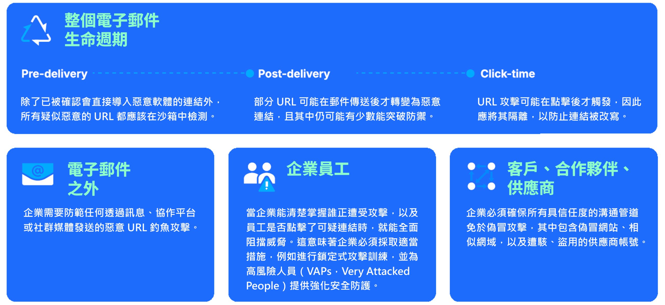 惡意連結攻擊不再侷限於電子郵件,還滲透到簡訊、協作平台、社群媒體、通訊軟體,甚至 SaaS 工具。這些攻擊往往難以察覺,且必須靠「人」的點擊才會成功。因此防禦策略必須涵蓋所有使用者,包括員工、客戶、合作夥伴與供應商,才能避免攻擊從任何一個管道滲透。