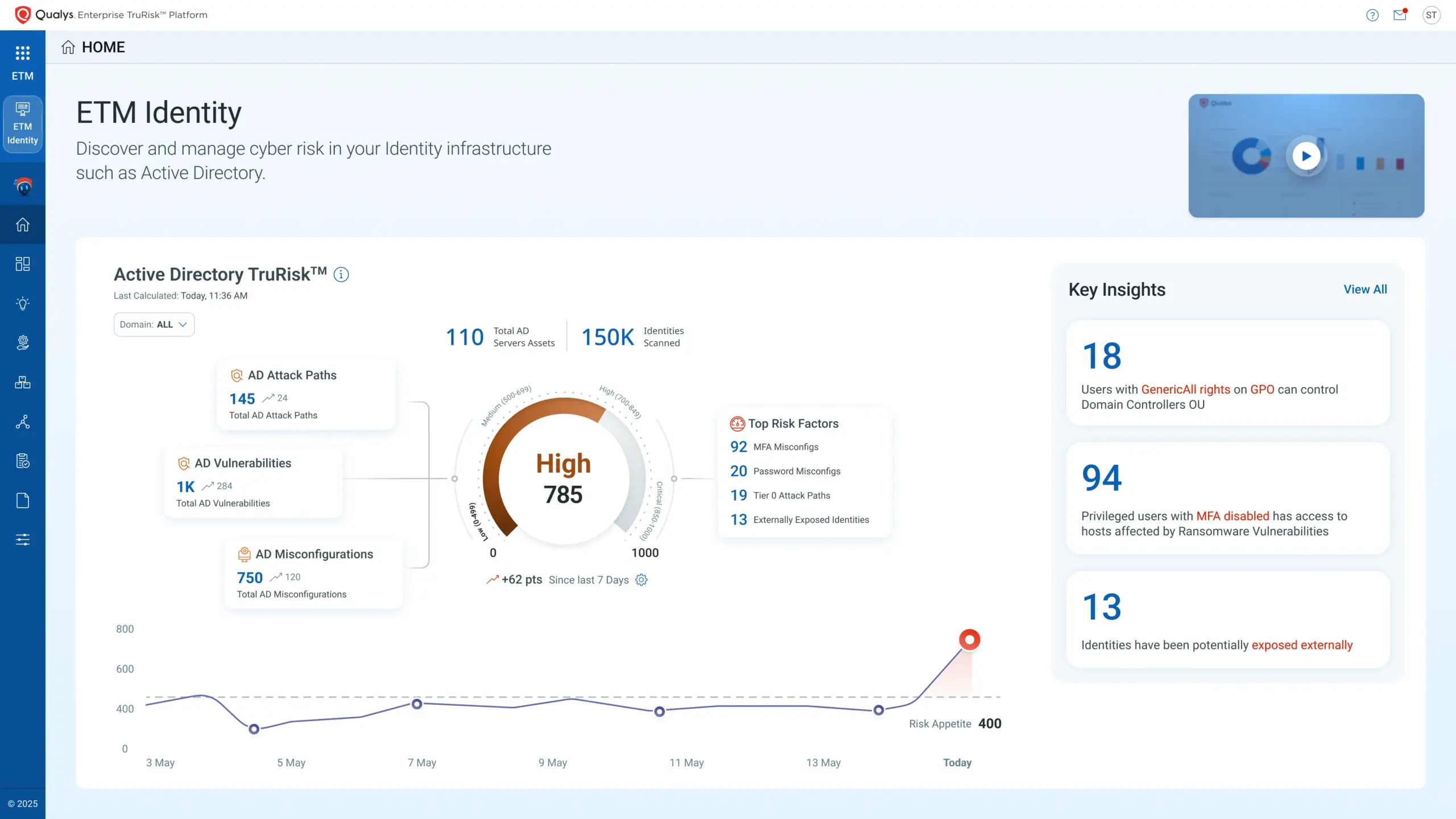 Qualys ETM Identity 將身分安全整合進 ROC,在單一平台中掌握使用者存取權限、發現 AD、Entra ID、Okta 及其他 IdP/IDaaS 中的錯誤配置與高風險權限,繪製潛在攻擊路徑與網域信任關係,並結合資產情境生成 TruRisk 分數,協助團隊優先處理最具可利用性的身分風險。透過自動化風險回應流程進行修復,包含政策控管、補丁更新、緩解或隔離措施,以及內建自動化腳本,企業能在不新增獨立工具的情況下,顯著減少因身分引起的攻擊面。