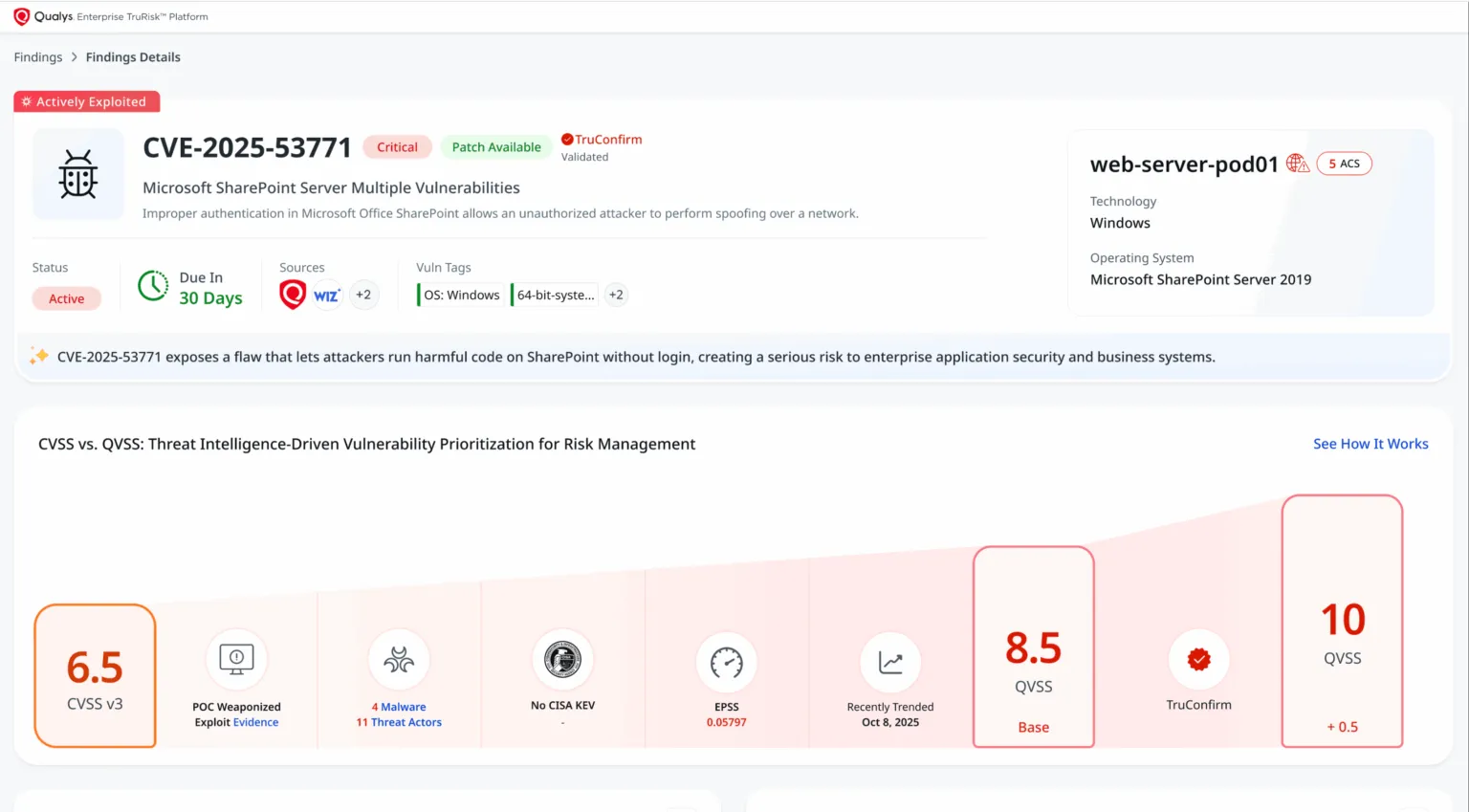這種精準的方式讓資安團隊能將資源聚焦在已被驗證的威脅上,減少修復工作量,並以清晰、可行的情資立即採取行動。TruConfirm 不僅加速威脅優先排序、縮短平均修復時間(MTTR),更能最大化資安團隊的整體效率。整合於 Qualys ETM 生態系統中,TruConfirm 能精簡流程、降低告警疲勞,並進一步強化企業整體防護能力。