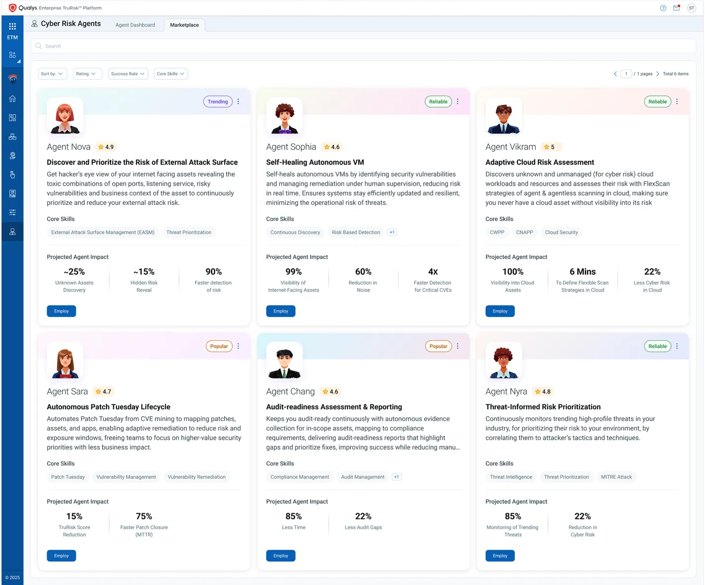 近期,Qualys 宣布這個框架的重要進化 —— AI 驅動的 ROC。藉由整合 Agentic AI 功能,資安防禦模式正徹底革新。如同擁有一位全天候 24X7 的智能資安專家,掌握環境全貌。Agentic AI 利用平台上的豐富資料,持續掃描各項風險暴露,精準識別並優先處理高風險漏洞,並自動執行最佳修復策略。基於這些資料,由智能風險助理組成的數位工作團隊,自動執行多個關鍵應用場景,或依照業務需求客製化流程,確保風險管理高效且持續運作。