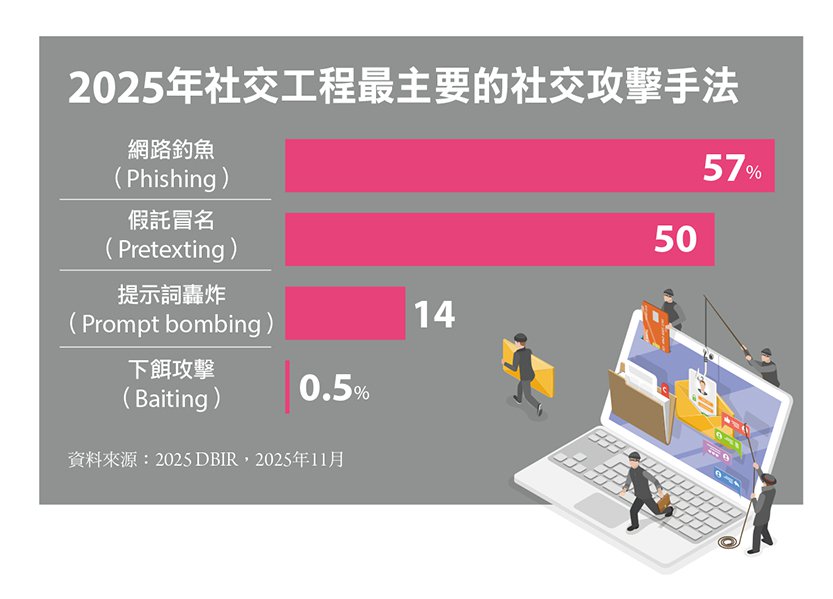 根據《資通安全署資安月報》統計,有三成的威脅來自於社交工程或資料收集,許多駭客從傳統的釣魚郵件到利用 AI 的深偽技術,創造更擬真的詐欺情境,並利用民眾的信任、恐懼和好奇心,進而做到竊取資料、騙取金錢以及控制電腦。 在數位世界中,資安防護已不再是伺服器和防火牆的冷硬技術之爭,而是一場針對人性的心理戰。當我們竭力提升網路防禦時,駭客卻將目光投向最脆弱、卻也最難防備的環節 ——「人」。許多資安業者的資安報告都揭示這個嚴峻事實,因為「社交工程(Social...