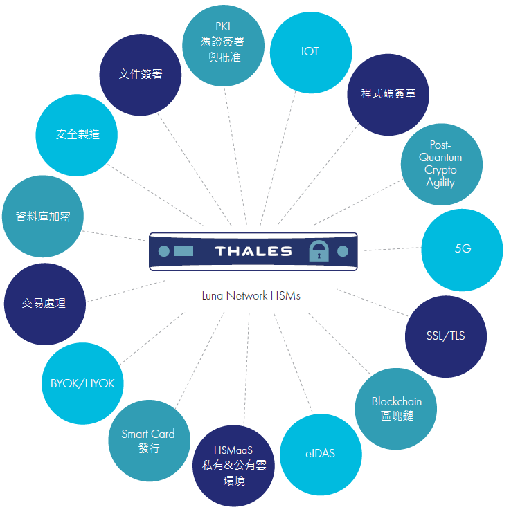 在 Thales Luna Network 硬體安全模組(HSM)中儲存、保護、管理金鑰,能以效能領先業界的高安全性、防竄改、網路連結功能,保障機敏資料和重要應用程式的安全。且 Luna Network HSM 可整合各種應用程式加速加密作業、保障金鑰週期安全、為整體加密設計提供最安全的信任基礎架構。